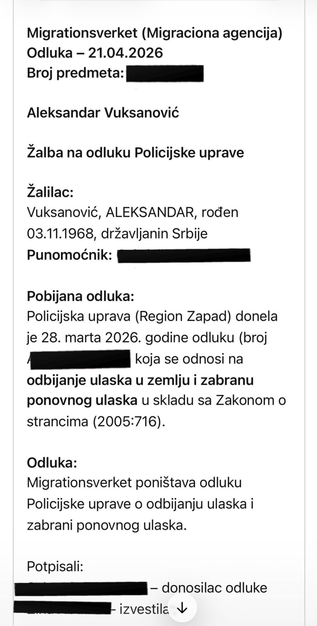Švedska migraciona agencija Migrationsverket donela je 21. aprila 2026. godine zvaničnu odluku kojom je potpuno poništila raniju odluku policije o proterivanju i zabrani ulaska u Švedsku najvećoj regionalnoj zvezdi Aci Lukasu.